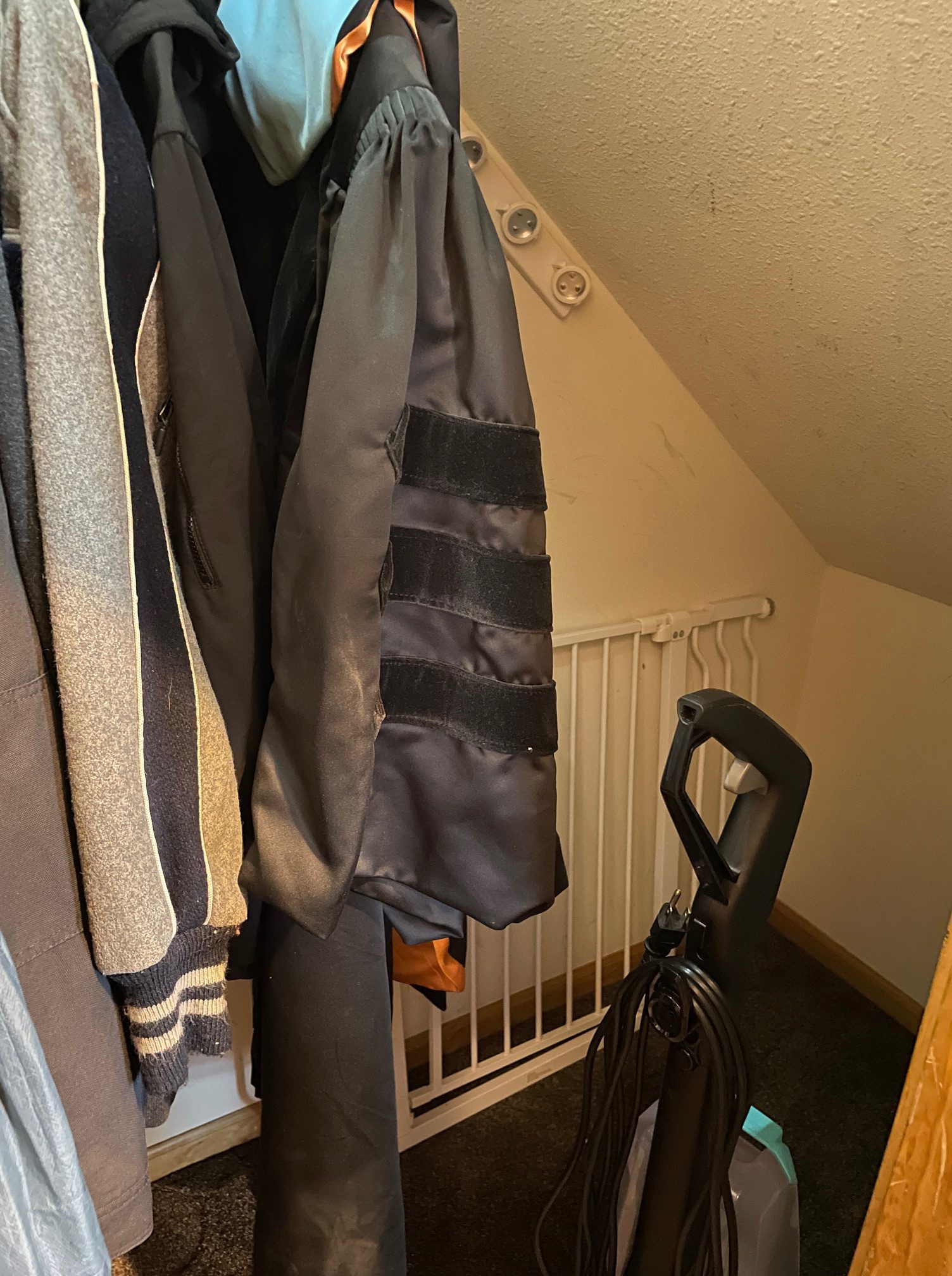And there are some things that, honestly, should have left the house this weekend that are still here. You may notice in the “after” photo of the closet under the stairs, my doctoral robe is hanging with the winter coats. I paid an obscene amount of money for this when I graduated because I was planning a future in academia and would have to wear it twice a year for convocation and graduation. That future did not come to pass and now the only thing that robe is good for is a Halloween costume.