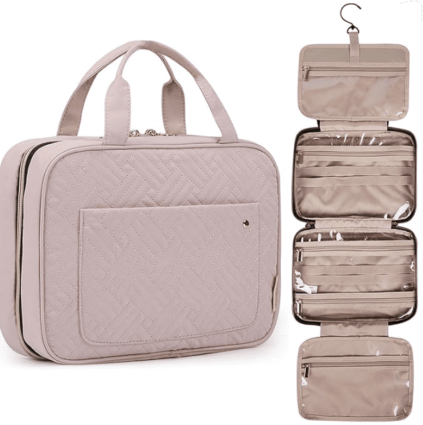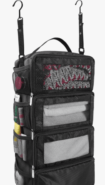 Steph – being a girl – brings a lot of extra stuff on a trip: makeup, lotion, hairspray, etc. A good toiletry bag is harder to find than you would expect. Most toiletry bags just dump all of the items in one bag, forcing the user to dig through to find the thing they need.