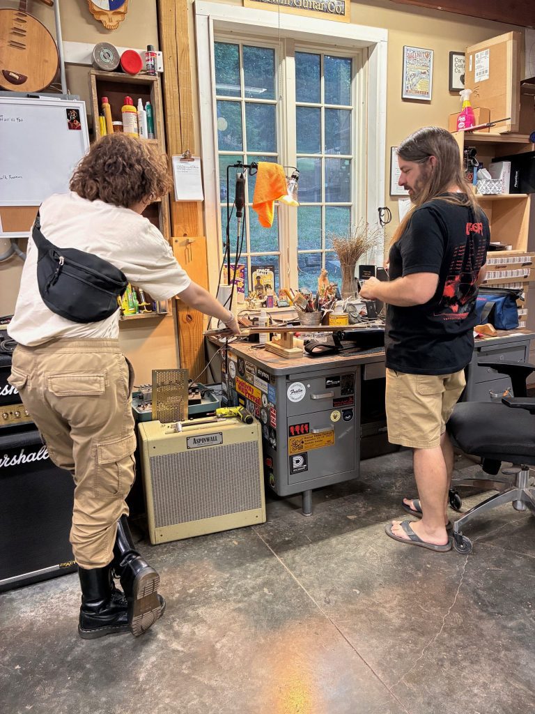 We decided a while ago that our 18th birthday/high school graduation gift to the kid would be a custom bass guitar. Gene got a custom bass a few years ago and it was a game changer. So last week we loaded into the car (on Gene’s birthday) and drive to Topeka to visit Corwin Guitars, the same place that built Gene’s bass. Danny Corwin listened to everything the kid wanted in a new bass and took copious notes. Everything will be custom: color, body shape, wood, neck measurements, hardware, electronics…everything. It will take 10-12 months to build, so it should be done the summer before college. Perfect timing!
